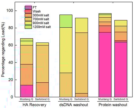 Assay results of chromatography for Mustang® Q and Sartobind® Q from Run #1. The percentages are calculated regarding loading material. Each fraction is shown with a different color. The first, second, and third two bars represent dsDNA, HA recovery, and proteins, respectively.