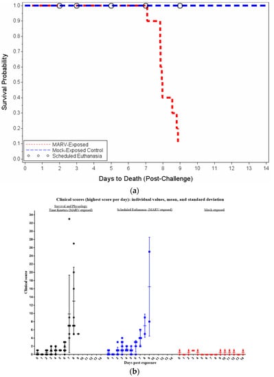 Survival and Clinical Scores. (a) Kaplan–Meier Time to Death Plot. (b) Daily Clinical Scores (Highest Score Per Day) in Cynomolgus macaques exposed to MARV or mock exposed: Group comparison with individual values, mean, and standard deviation displayed. One animal in the scheduled euthanasia group was found dead on the day of the scheduled euthanasia; this animal is included in the scheduled euthanasia group in the figure.