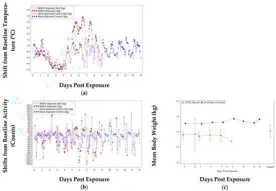 For body weight, the mean decrease from baseline (Study Day 0) was statistically significant for animals in the MARV-exposed group on Study Days 3 and 7. There was a significant group effect on Study Day 7 (p < 0.05). Figure 2c displays the group mean changes from baseline weight.