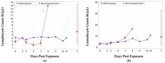 For MARV-exposed animals, on Day 3, there were significant decreases from baseline in lymphocyte relative percentages and a corresponding increase in relative percentages of granulocytes. This continued, and on Day 5, there was a significant decrease from baseline for MARV-exposed animals for lymphocytes and also monocytes (absolute counts and relative percentages) and a corresponding increase in granulocytes (absolute counts and relative percentages); the group effect was significant for monocytes. By Day 7, relative percentages for lymphocytes remained decreased, and there were significantly increased total WBC (absolute counts) and granulocytes (absolute counts and percentages). On Day 9, there was a significant increase as a proportion of baseline in lymphocyte absolute counts; the group effect was also significant on this day. Figure 3 displays mean absolute counts over time for each group.