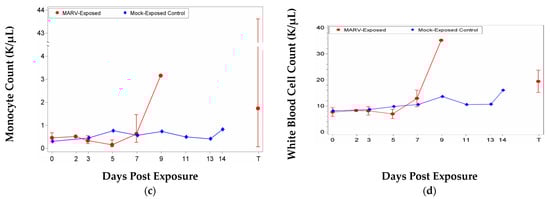 Complete blood counts and clinical chemistry analyses were performed on whole blood collected from MARV-exposed and mock-exposed animals at scheduled time points during the study. Various hematology parameters were significantly increased or decreased from baseline on at least one study day in each of the MARV-exposed and mock-exposed groups. Significant group effects were also noted for at least one study day for different populations of white blood cells (WBCs): absolute counts and relative percentages for monocytes, eosinophils, and basophils; and absolute count for lymphocytes.
