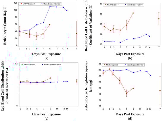 Changes in certain parameters related to red blood cells (RBC) can be symptomatic of several conditions, including anemia and bleeding. However, within this study, decreases in RBCs (along with concomitant increases in reticulocytes), hematocrit (HCT), hemoglobin (HGB), may have been related to repeated blood collection, as there were significant decreases from baseline for both groups on Study Day 7, and there was no significant group effect on any study day. Reticulocyte counts and percentages exhibited a significant decrease from baseline for the MARV-exposed group on Study Day 3; the increase seen in mock-exposed animals may be due to repeated blood collections. Red blood cell distribution width coefficient of variation (RDW-CV) and red blood cell distribution width standard deviation (RDW-SD) also exhibited significant decreases from baseline on Study Day 3 and a significant increase from baseline on Study Day 9. The group effect was significant on Study Day 9. Reticulocyte hemoglobin equivalent (RET-He) exhibited significant decreases from baseline on Study Days 5, 7, and at Terminal. The group effect was significant on Study Day 7. Data are shown in Figure 4.
