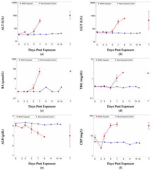 Clinical chemistry analyses were performed on whole blood (collected in tubes containing EDTA) collected from MARV-exposed and mock-exposed animals at the scheduled time points during the study and prior to euthanasia. Mock-exposed animals did not exhibit significant changes in clinical chemistry parameters. MARV-exposed animals euthanized on or after Day 7 showed changes in clinical chemistry parameters (ALT, GGT, BA, TBIL, and ALB) indicative of marked liver malfunction (Figure 5a–e). C-reactive protein (analysis performed on serum), a marker of inflammation, was also increased (Figure 5f).