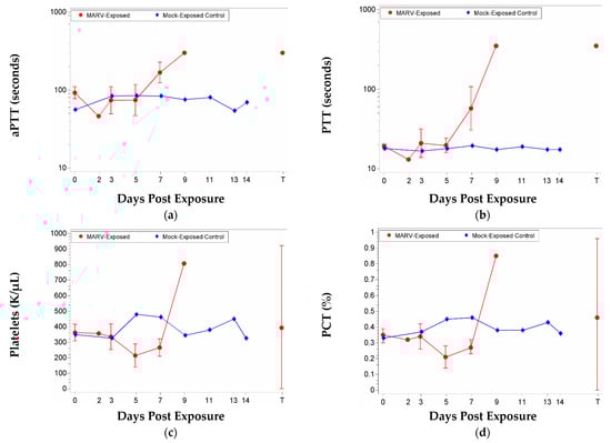 Coagulation was measured by analyzing the activated partial thromboplastin time (aPTT), prothrombin time (PTT), and platelet count at the scheduled time points post exposure and prior to euthanasia (Figure 6). The data indicate coagulopathy evidenced by decreased platelets beginning on Day 5 and prolonged clotting times beginning on Day 7. The MARV-exposed group experienced significant increases from baseline on Study Day 7 and at Terminal for aPTT, and on Study Days 7 and 9 for PTT. The group effect was significant on Study Day 9 for PTT. Platelet counts and plateletcrit (PCT) exhibited significant decreases from baseline for the MARV-exposed group on Study Days 5 and 7. The group effect was significant on Study Day 5.