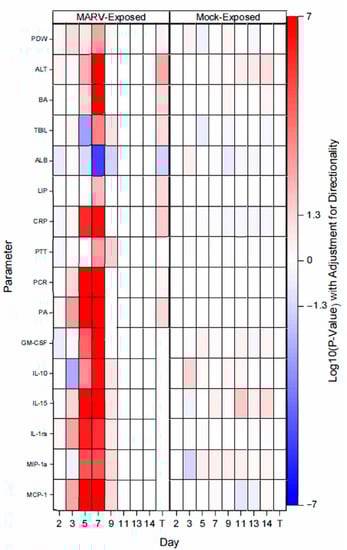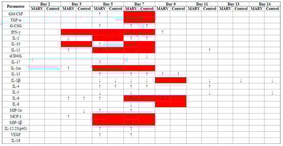 Cytokine and chemokine changes from baseline throughout study for MARV-exposed versus mock-exposed group. Arrows (↑, ↓) indicate that the mean on the study day was significantly greater (“↑”) or less (“↓”) than that at the baseline (Day 0) at the 0.05 level. Red shaded cells indicate that the change from baseline for the MARV-exposed group was significantly different to that of the mock-exposed control group at the 0.05 level. For days 11, 12, and 14, only samples from mock-exposed animals were available.