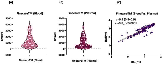 (A) Point distribution of fingerstick whole blood samples. (B) Point distribution of plasma samples. (C) Correlation and linear regression analysis between matched fingerstick whole blood sample and plasma sample using FinecareTM (n = 156). Pearson correlation coefficient (r), coefficient of determination (r2), and p-value are shown.