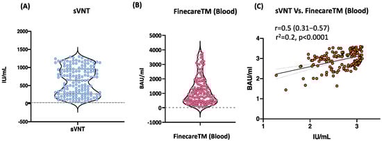 Correlation and linear regression analyses between FinecareTM and each commercial serological immunoassay and the sVNT were performed. Pearson correlation coefficient (r) was calculated. For absolute values of Pearson’s r, 0–0.19 was denoted as very weak, 0.2–0.39 as weak, 0.40–0.59 as moderate, 0.6–0.79 as strong, and 0.8–1 as very strong correlation [].