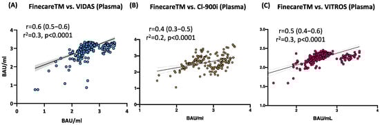 Correlation and linear regression analysis between FinecareTM and (A) VIDAS®3; (B) CL-900i®; (C) VITROS®. Pearson correlation coefficient (r), coefficient of determination (r2), and p-value are shown; n = 488.
