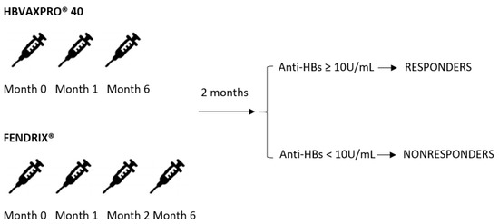 - Domingo, I.G.; Acevedo, J.P.; Vargas, A.A.; Cuadra, A.R.; Ríos, M.F.; Martin, J.S.; Mota, M.S.; Gallego, A.G.; Artacho, G.S. Response to Vaccination Against Hepatitis B Virus with a Schedule of Four 40-μg Doses in Cirrhotic Patients Evaluated for Liver Transplantation: Factors Associated with a Response. Transplant. Proc. 2012, 44, 1499–1501. [Google Scholar] [CrossRef]