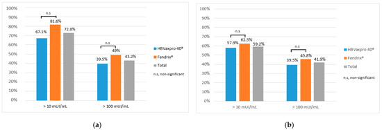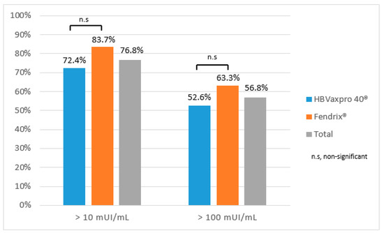 - Engler, S.H.; Sauer, P.W.; Golling, M.; Klar, E.A.; Benz, C.; Stremmel, W.; Kallinowski, B. Immunogenicity of two accelerated hepatitis B vaccination protocols in liver transplant candidates. Eur. J. Gastroenterol. Hepatol. 2001, 13, 363–367. [Google Scholar] [CrossRef] [PubMed]