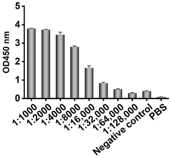 ELISA was applied to identify the binding activity of purified recombinant BsNb. The microplate was precoated with CD20 extracellular peptide, and gradient-diluted recombinant BsNb was used as the detection antibody, while pET-22b (+) empty vector-transformed bacterial lysates were used as a negative control, as shown in Figure 6. The results showed that the binding of recombinant BsNb to CD20 extracellular peptides occurred in a concentration-dependent manner, and the binding activity became weaker as the concentration of recombinant BsNb decreased.