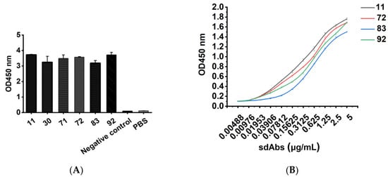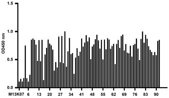 Phage ELISA was used to identify the recombinant phage after three rounds of screening. PBS was used as a blank control, the helper phage M13K07 was used as a negative control, and the OD450 nm value of the negative control was 0.105. Fifty-four clones were detected with OD450 nm values much higher than 0.210, as shown in Figure 2. The results indicated that the recombinant phages produced by 54 of the 92 clones had high antigen-binding activity. The six strains with high binding ability were named 11, 30, 71, 72, 83, and 92 and were further expressed, purified, and identified.