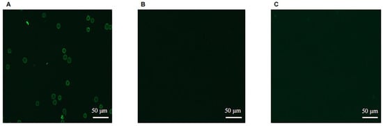 After the cultured Raji cells were fixed, the recombinant single-domain antibody was used as the primary antibody, and CoraLite® 488-conjugated 6 × His His-Tag Mouse Monoclonal antibody was used as the secondary antibody for visualization and analysis, as shown in Figure 4. The results showed that the Raji cells expressing CD20 molecules on the surface could be specifically stained by the antibody and produced bright green fluorescence, which formed a ring of fluorescence around the cell periphery (Figure 4A). However, the control group did not show any fluorescence signal in the absence of the single-domain antibody used for detection (Figure 4B) or by fixing the unrelated cell line HEK293A, which did not express CD20 molecule on the surface, and then detected with the single-domain antibody (Figure 4C). These results further proved that sdAbs could recognize and bind to the CD20 molecules on the surface of Raji cells in their native form.