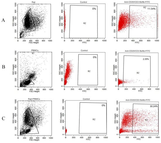 The binding activity of anti-CD20/CD3 BsNb to CD20 and CD3 was evaluated by flow cytometry analysis. The CD20-expressing lymphoma cell line Raji cells, CD3-expressing human PBMCs and Raji cells, and PBMCs mixed with the same number of cells were incubated with FITC-labeled anti-CD20/CD3 BsNb. Binding of anti-CD20/CD3 BsNb to Raji cells (Figure 7A), freshly isolated PBMCs (Figure 7B), and a mixed group of Raji cells and PBMCs (Figure 7C) was observed. The results showed that FITC-labeled anti-CD20/CD3 BsNb could bind to Raji cells and freshly isolated PBMCs independently or in the mixed cells.