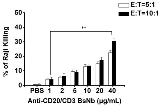 The LDH assay was used to determine the anti-CD20/CD3 BsNb-mediated killing activity of PBMCs against tumor cells. Raji cells were cultured in a PerkinElmer Cell Carrier for 12 h. PBMCs were added to each group in three parallel wells at ratios of effector: target = 5:1 and effector: target = 10:1, and anti-CD20/CD3 BsNb was added to the experimental group to a final concentration of 40 μg/mL, 20 μg/mL, 10 μg/mL, 5 μg/mL, 2 μg/mL, and 1 μg/mL. Then, 100 μL RPMI 1640 medium was added to blank wells, 50 μL of Raji cells + 50 μL of PBMCs were added to sample control wells, and 50 μL of Raji cells + 50 μL of PBMCs + 10 μL of lysate were added to maximum enzyme activity control wells and incubated for 24 h at 37 °C. Then, 10 μL of lysate was added to the target cell maximum release wells 1 h before the end of incubation and mixed thoroughly. The optical density was measured at OD490 nm with a microplate reader, and the mortality rate of Raji cells was calculated using the following common formula: mortality rate (%) = {[(sample well OD490 nm-blank well OD490 nm) − (sample control well OD490 nm-blank well OD490 nm)]/(maximum enzyme activity control well OD490 nm-blank well OD490 nm)} × 100% (** p < 0.01).