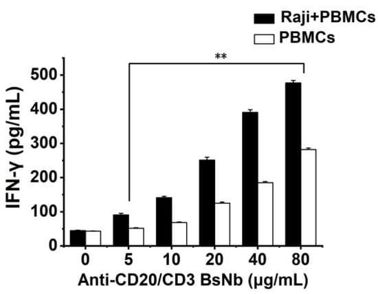 Detection of the effect of anti-CD20/CD3 BsNb on the secretion of cytokines by PBMCs in the presence or absence of Raji cells by ELISA. Raji cells were cultured in PerkinElmer Cell Carrier for 12 h with 3 parallel wells in each group, and effector cell PBMCs with the effector: target ratio = 10:1 were added to the experimental group. PBMCs cells were cultured in PerkinElmer Cell Carrier for 12 h with three parallel wells in each group and the same volume of medium added as the control group. The final concentrations of anti-CD20/CD3 BsNb were 80 μg/mL, 40 μg/mL, 20 μg/mL, 10 μg/mL, 5 μg/mL and 0 μg/mL were added to the Wells. The level of IFN-γ was determined with the ELISA method and calculated from the standard curve (** p < 0.01).