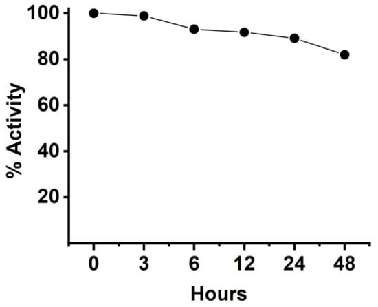 Therapeutic antibodies are obtained through complex biotechnology, and in order to safely use them as therapeutic agents, it is necessary to determine the stability of protein-based drugs in addition to studying their functional activity in vitro. Therefore, we determined the stability of anti-CD20/CD3 BsNb in human serum at 37 °C for different incubation times, as shown in Figure 10. The stability of 3 h, 6 h, 12 h, 24 h, and 48 h was compared with the negative control. The results showed that anti-CD20/CD3 BsNb could still maintain suitable stability after 48 h incubation in human serum at 37 °C, and the binding activity was still retained at 80% if compared with the control group, as shown in Figure 10.