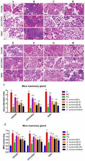Functions of scFvs on histopathological changes in S. aureus-induced mammary gland tissues by H & E staining. (A) Control group; (B) negative control group; (C) positive control group; (D) scFvs mixture group; (E–H) single scFv group (ZL4, ZL15, ZL26 and ZL125, respectively); (I) Tissue alteration index in mammary gland tissues; (J) MPO activity assay. Red arrow was tissue lesion area (red arrow indicates inflammatory cells infiltration in mammary gland tissues). Data represent mean results ± SD (n = 6). # p < 0.05 vs. scFvs mixture group. * p < 0.05 vs. negative control group.