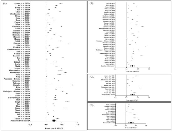 The global prevalence of hesitancy to COVID-19 vaccination (event rate: 0.25; 95% CI: 0.20, 0.32; p Egger: 1.2580; p heterogeneity: <0.0001; p: <0.0001) (A). The prevalence of hesitancy to COVID-19 vaccination among general population (event rate: 0.25; 95% CI: 0.18, 0.34; p Egger: 1.3090; p heterogeneity: <0.0001; p: <0.0001) (B). The prevalence of hesitancy to COVID-19 vaccination among healthcare workers (event rate: 0.26; 95% CI: 0.18, 0.37; p Egger: 0.7670; p heterogeneity: <0.0001; p: <0.0001) (C). The prevalence of hesitancy to COVID-19 vaccination among students (event rate: 0.25; 95% CI: 0.14, 0.40; p Egger: 1.2090; p heterogeneity: <0.0001; p: 0.0030) (D). The studies included are provided in the reference list [19,25,26,27,28,29,30,31,32,33,34,35,36,37,38,39,40,41,42,43,44,45,46,47,48,49,50,51,52,53,54,55,56,57,58,59,60,61,62,63,64,65,66,67,68,69,70,71,72,73,74,75,76,77,78,79].