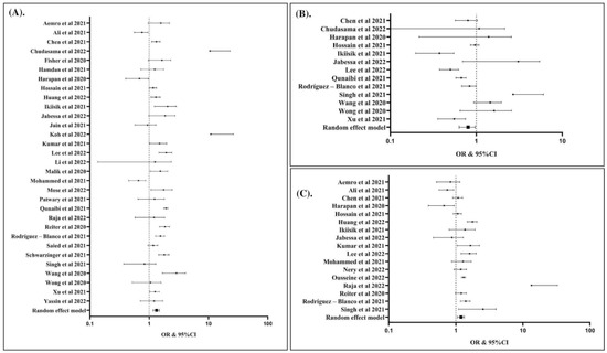 Individuals with the education levels < BSC had higher risk of hesitancy to COVID-19 vaccination than ≥ BSC (OR: 1.30; 95% CI: 1.03, 1.65; p Egger: 0.5260; p heterogeneity: <0.0001; p: 0.0300) (A); individuals having the healthcare-related job had lower risk of hesitancy to COVID-19 vaccination (OR: 0.68; 95% CI: 0.52, 0.89; p Egger: 0.3340; p heterogeneity: <0.0001; p: 0.0040) (B); Individuals considering that COVID-19 vaccines are not safe had higher risk of hesitancy to COVID-19 vaccination (OR: 2.24; 95% CI: 1.21, 4.14; p Egger: 0.7000; p heterogeneity: <0.0001; p: 0.0100) (C). The studies included are provided in the reference list [19,25,26,27,28,29,30,31,32,33,34,35,36,37,38,39,40,41,42,43,44,45,46,47,48,49,50,51,52,53,54,55,56,57,58,59,60,61,62,63,64,65,66,67,68,69,70,71,72,73,74,75,76,77,78,79].