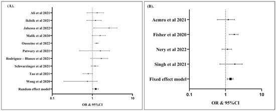 Unemployed individuals were associated with increased risk of hesitancy to COVID-19 vaccination compared to working individuals (OR: 1.20; 95% CI: 1.02, 1.42; p Egger: 0.1790; p heterogeneity: 0.0090; p: 0.0300) (A); individuals with household number ≥ 5 individuals had higher risk of hesitancy to COVID-19 vaccination (OR: 1.36; 95% CI: 1.13, 1.63; p Egger: 0.1680; p heterogeneity: 0.1620; p: 0.0010) (B). The studies included are provided in the reference list [19,25,26,27,28,29,30,31,32,33,34,35,36,37,38,39,40,41,42,43,44,45,46,47,48,49,50,51,52,53,54,55,56,57,58,59,60,61,62,63,64,65,66,67,68,69,70,71,72,73,74,75,76,77,78,79].