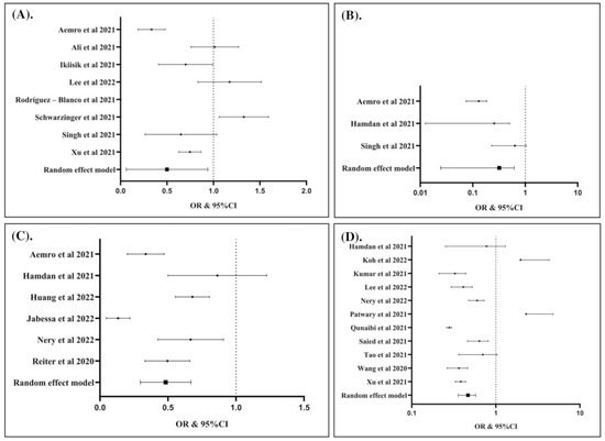 Individuals living with children in the home had lower risk of hesitancy to COVID-19 vaccination (OR: 0.37; 95% CI: 0.14, 0.99; p Egger: 1.4040; p heterogeneity: <0.0001; p: 0.0490) (A); individuals keeping physical distancing had lower risk of hesitancy to COVID-19 vaccination (OR: 0.23; 95% CI: 0.08, 0.65; p Egger: 0.8370; p heterogeneity: 0.0010; p: 0.0050 (B); individuals with history of COVID-19 test were associated with lower risk of hesitancy to COVID-19 vaccination (OR: 0.46; 95% CI: 0.31, 0.68; p Egger: 0.4340; p heterogeneity: <0.0001; p: <0.0001) (C); individuals with history of influenza vaccination in the past few years had lower risk of hesitancy to COVID-19 vaccination (OR: 0.46; 95% CI: 0.36, 0.58; p Egger: 0.3460; p heterogeneity: <0.0001; p: <0.0001) (D). The studies included are provided in the reference list [19,25,26,27,28,29,30,31,32,33,34,35,36,37,38,39,40,41,42,43,44,45,46,47,48,49,50,51,52,53,54,55,56,57,58,59,60,61,62,63,64,65,66,67,68,69,70,71,72,73,74,75,76,77,78,79].