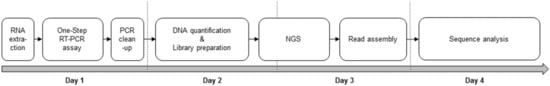 Molecular characterization and phylogenetic analysis of viral genomes are critical biomolecular tools in epidemiology, clinical virology, and public health. Genomic sequencing has evolved rapidly in the last years. Sanger sequencing has been the standard method in DNA sequencing for almost 40 years. However, next-generation sequencing (NGS) methodologies are now revolutionizing this branch of science, including epidemiology and virology [1,2]. The experience of the recent SARS-CoV-2 pandemic has further highlighted the need to have NGS workflows promptly available in order to expand public health preparedness and response capacity: in fact, NGS contributed to determine SARS-CoV-2 ecology and spread pattern, and it proved to be an unbiased way to accurately identify new virus variants and study their evolution, which are critical aspects to design effective control and prevention strategies [3,4].