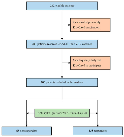 Of the 242 hemodialysis patients who were screened for eligibility, 36 were excluded. Of those who were excluded, 9 were previously vaccinated, 12 refused vaccination, 3 were dialyzed twice weekly, and 12 declined to participate, leaving a total of 206 patients in the final study population (Figure 1). The baseline characteristics of the participants stratified according to their anti-spike antibody levels into responders (≥50 AU/mL) and non-responders (<50 AU/mL) are presented in Table 1. Overall, the mean age was 67 ± 13 years, 49.5% were women, and 54.4% had diabetes. The mean dialysis vintage was 8.4 ± 5.8 years. Non-responders (n = 68) represented 33% of our cohort. Non-responders were generally older, had a lower BMI, and had a higher prevalence of CAD than responders. Non-responders were also more likely to have a higher use of immunosuppressants and had a lower lymphocyte count than responders.