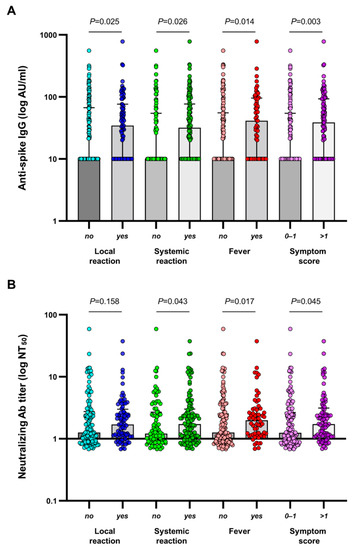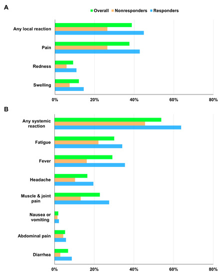 (A) Solicited local and (B) systemic reactions within 1 week after ChAdOx1 nCoV-19 vaccination according to anti-spike antibody response at day 28.