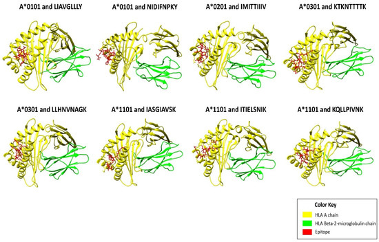 Figure showing structural interactions between the prioritized HLA I epitopes (colored in red) and cognate HLA I chains (colored in yellow and green). Out of all the HLA I epitopes, KTKNTTTTK (from the G glycoprotein) showed the best docking score (−113.8) with cognate HLA I molecule HLA-A*0301, followed by epitope LLHNVNAGK (−104.2) of the F glycoprotein with HLA-A*0301, and so on. It can be observed that all the epitopes fit comfortably inside the binding groove of the HLA molecule and thus are projected to interact strongly with their cognate HLA I allele.