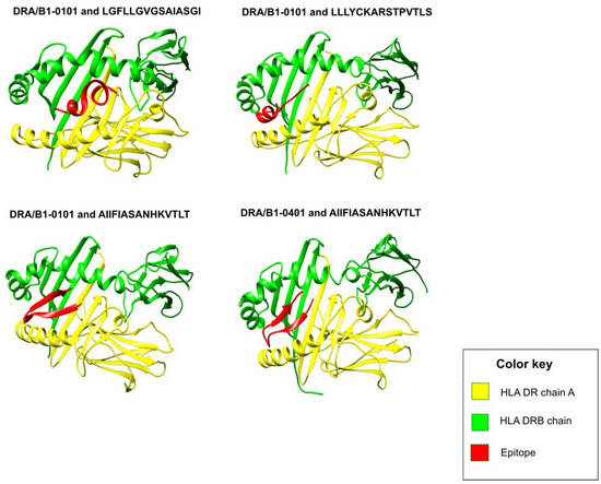 Figure showing structural interactions between the prioritized HLA II epitopes (colored in red) and cognate HLA II chains (colored in yellow and green). Out of all the HLA II epitopes, AIIFIASANHKVTLT (from the G glycoprotein) showed the best HADDOCK scores of −117.4 and −117.1 with HLA DRA/B1*0101 and HLA DRA/B1*0401, respectively. It can be observed that all the epitopes fit comfortably inside the binding groove of the HLA molecule (formed between the two HLA chains shown in yellow and green color, respectively), and thus are projected to interact strongly with their cognate HLA II allele.