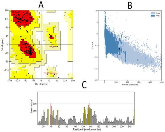 Structural evaluations of the modeled multi-epitope vaccine confirmed its high quality and stability using (A) Ramachandran plot analysis. It was confirmed that a total of 89% of the modeled residues resided in the most favored red region (indicated by capital letters A, B) whereas 9.5% and 1.5% residues resided in the additionally allowed bright yellow regions (indicated by small letters a, b) and generously allowed light yellow regions (indicated by ~a, ~b) respectively. Outlier regions are those having white background color. Glycine residues are indicated by triangles. (B) Prosa quality check confirmed that the modeled structure’s quality lies within the range of similar experimentally resolved NMR structures, with a Z-score of −6.47. (C) Stereochemical check by the ERRAT server revealed a high ERRAT score of 91.4286 that signifies that a good quality refined structure was obtained. On the error axis, two lines are drawn to indicate the confidence with which we can reject the regions that exceed that exceed that error value. Regions that have greater than 95% error are indicated by yellow color, whereas in rare cases residues having greater than 99% error values were found, indicated by red color.