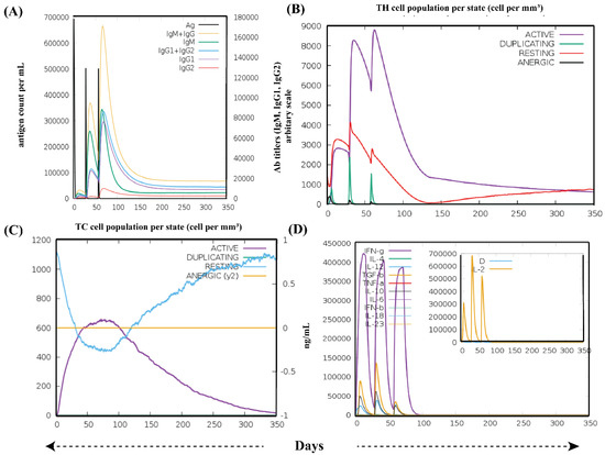 In order to conduct computer-aided investigations on the immune potential of the vaccine, the C-ImmSim (http://kraken.iac.rm.cnr.it/C-IMMSIM/ accessed on 12 August 2021) server was used [69]. By combining a position-specific scoring matrix with machine learning, this server assesses epitope prediction and dynamic immunological activities. The whole analysis was performed using the protocol previously reported [70,71]. Briefly, three in silico doses were administered four weeks apart, at time steps of 1, 84, and 168 (single time step equals 8 h of daily life), respectively, for a total of 1050 simulation steps (about 12 months). Nevertheless, the default values of remaining parameters were used.