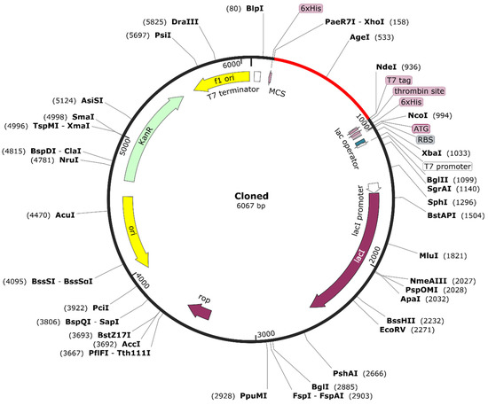 Upon optimizing the codon sequence of the RSV vaccine, the length of the cDNA sequence was found to be 771 nucleotides (Supplementary Material, File S2). The obtained CAI (0.97) revealed that the adapted sequence is composed of codons suitable for using the target organism’s cellular machinery. Besides, the GC content (52.39%) after codon optimization was found to be acceptable. Therefore, ease of expression is guaranteed inside the E. coli K12 strain. Towards the N and C termini of codon-optimized nucleotides, the restriction sites of XhoI and NdeI enzymes were conjugated, respectively (Figure 8). In order to clone the vaccine, the final optimized sequence was placed within the pET28a (+) vector between the XhoI (158) and NdeI (936) positions. The cloned plasmid had a final length of 6607 bp.