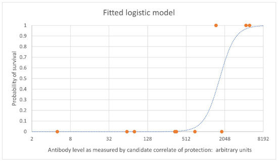 Figure 1 shows an example of an estimated logistic relationship between vaccine-induced antibody levels pre-challenge (on the x axis) and the probability of survival at a given timepoint following challenge in NHPs (on the y axis). Each orange point represents individual NHPs that survived (at 1 on the y axis) and those that died (at 0 on the y axis), with their antibody level on the x axis. The blue dashed line is the estimated logistic model relating antibody level to the probability of survival based on the data set.