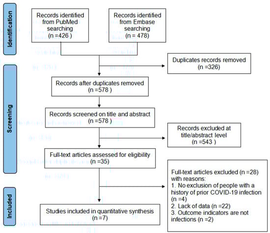 A total of 904 records were identified from the literature search. After removing duplicates, 578 articles were identified and subsequently screened by title, abstract, and full text. After excluding the ineligible studies from the title or abstract screening, 35 studies were reviewed in full text. As a result, seven studies (nine datasets) met the criteria and were included in this study. Studies reporting the efficacy of different dominant variants were treated as a separate dataset in the meta-analysis (Figure 1).