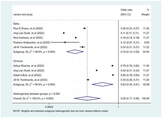 The I2 statistic was applied to assess the heterogeneity between studies. If I2 > 50%, which indicates a high heterogeneity, the random-effects model was recommended. Meanwhile, if I2 < 50%, the fixed effects model was normally employed for the analysis. Pooled odds ratio (OR) and 95% confidence interval (95% CI) estimates were calculated to determine the association between COVID-19 vaccine booster shots and infection. Dominant variants were considered for subgroup analysis to further identify the sources of heterogeneity. A two-tailed p < 0.05 was deemed to be statistically significant. Statistical analyses were conducted by STATA/SE version 16.0 (StataCorp, College Station, TX, USA).