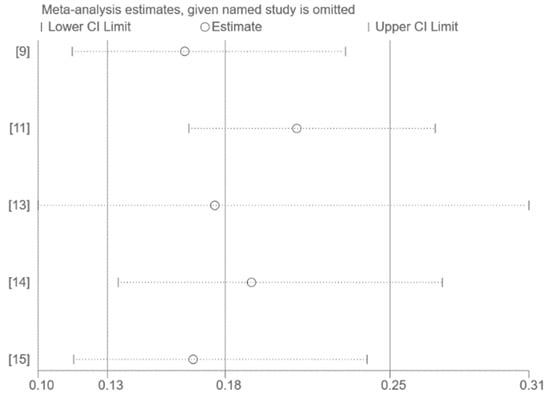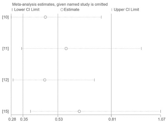 The use of funnel plots and Egger’s test for publication bias assessment was not feasible on account of the small number of studies included in the pooled analysis (n < 10). Sensitivity analysis by excluding one study at a time had no significant effect on the results (Figure 3, Figure 4 and Figure 5).