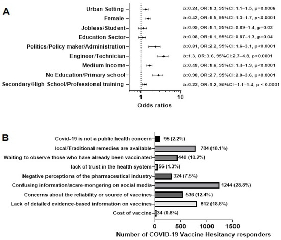 The study showed that 4352 responders (64.6%) hesitated to take a COVID-19 vaccine. The Multiple Logistics Regression analysis showed that living in an urban setting (b: 0.24, OR: 1.3, 95% CI: 1.1–1.5, p = 0.0006), being a female (b: 0.42, OR: 1.5, 95% CI: 1.3–1.7, p < 0.0001), jobless or a student (b: 0.09, OR: 1.1, 95% CI: 0.89–1.4, p = 0.03), and working in the education sector (b: 0.08, OR: 1.1, 95% CI: 0.87–1.3, p = 0.04) will likely lead to COVID-19 VH. Being in politics/policy-making/administration (b: 0.81, OR: 2.2, 95% CI: 1.6–3.1, p < 0.0001) and being an engineer or technician (b: 1.3, OR: 3.6, 95% CI: 2.7–4.8, p < 0.0001) was associated with COVID-19 VH. This was also true for people with medium income (b: 0.48, OR: 1.6, 95% CI: 1.4–1.9, p < 0.0001), those that had no education or only studied to the primary school level (b: 0.98, OR: 2.7, 95% CI: 2.0–3.6, p < 0.0001), and had secondary/high school/professional training (b: 0.22, OR: 1.2, 95% CI = 1.1–1.4, p < 0.0001) (Figure 1A).