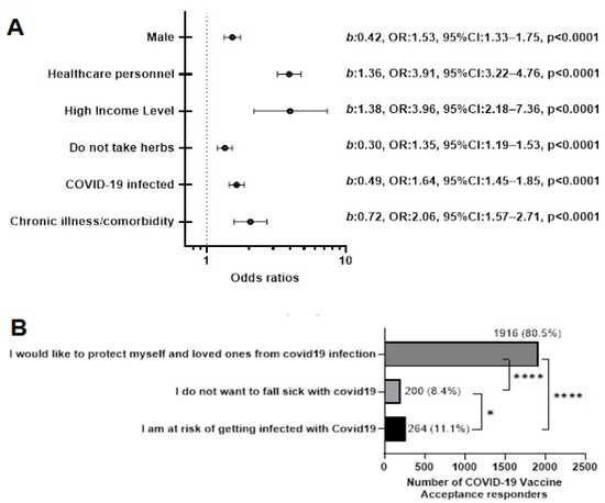 COVID-19 Vaccine Acceptance Cohort. (A) Using multiple logistic regression to identify factors that can likely lead to vaccine acceptance. (B) The reasons why persons in the vaccine acceptance cohort would give their consent to take a COVID-19 vaccine. * p < 0.01, **** p < 0.00001. The different bar colours represent the different options for the participants.