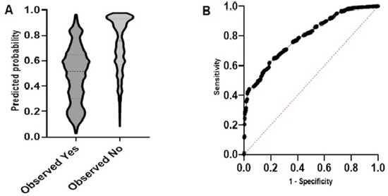 Model diagnosis. (A) Predicted probability graph to show how accurate the model was at predicting the outcome of the study. (B) The ROC curve shows the ability of the model to correctly classify each cohort of the study (area = 0.81, 95% CI: 0.97–0.81, p < 0.0001).