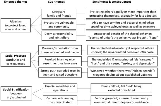 We identified three primary emerging themes related to the social and interpersonal domains contributing to participants’ behavior or position on the COVID-19 vaccine: (1) the strong desire to protect those around oneself, which might extend to the larger community; (2) varied forms of social pressure intended to induce vaccine uptake, sometimes to the participant’s subsequent resentment; and (3) social stratification between vaccinated and unvaccinated individuals.