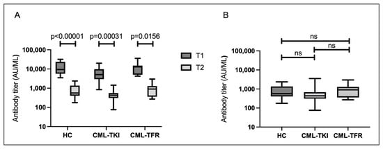 Serological responses approximately 6 months after the second vaccination. Boxes show the interquartile range; the center line indicates the median; and the whiskers indicate maximum and minimum values. (A) Paired sample comparison of median SARS-CoV-2 spike protein immunoglobulin G (S-IgG) titers between T1 and T2 in the three groups. (B) S-IgG titers in healthy controls (HCs) (n = 16), in chronic myeloid leukemia patients who continued TKI treatment (CML-TKIs) (n = 27), and those who discontinued TKIs and maintained TFR (CML-TFRs) (n = 7). Abbreviations: ns, not significant.