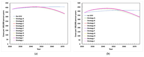 The projected incidence of HZ between 2022 and 2072 following UVV in the base-case scenario is depicted in Figure 3a. Without UVV, HZ incidence peaked in 40 years (2062), rising from 382 to 408 cases per 100,000 person-years (a 6.8% increase). Following UVV, HZ incidence peaked during the first 20–22 years (2042–2044) at around 402–409 cases per 100,000 person-years, a 5.3–7.1% increase compared to pre-UVV rates. HZ incidence began to decline under all UVV strategies around 2045 and fell below the pre-UVV incidence rate by 2050. By 2072, HZ incidence was estimated at around 328–335 cases per 100,000 person-years, a 12.2–14.1% decrease compared to the pre-UVV period.