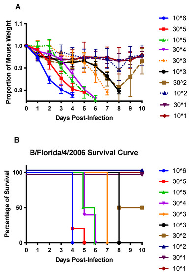 Influenza viruses continuously emerge as drift variants, which can cause annual epidemics and periodic pandemics; however, little is known about IBV compared to IAV. Research has demonstrated the need for universal immunity to IAV and IBV strains [45]; however, this can only be achieved by a better understanding of the immunity and disease pathogenesis of these viruses. Despite the substantial disease burden in humans associated with IBV infection, studies in animal models are limited, as IBV infection is less permissive than IAV [46]. In this study, the LD50 for B/Florida/04/2006 in B6 mice was determined and shown to be 3 × 102 PFU/mouse, which caused disease (e.g., weight loss and lethargy) with 100% mortality occurring at 103 PFU/mouse or higher inoculums. Most infected mice progressively lost weight until day 6 pi and thereafter exhibited dramatic weight loss that resulted in some death or the need for euthanasia (≥20% weight loss).
