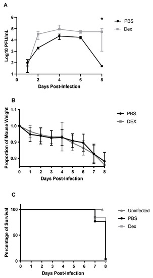 The lung viral titers were determined on days 1, 2, 4, 6, and 8 pi in PBS- and DEX-treated B6 mice (Figure 2A). Overall, there was a significant difference (p < 0.05) between the PBS- and DEX-treated mice in viral lung titers (Figure 2A). While DEX-treated mice still had high lung titers (>104 PFU) on day 8 pi, PBS-treated mice had mostly cleared detectable lung virus loads by day 8 pi. Despite this difference, both groups of mice continued to lose body weight, reaching ≥20% body weight loss, which required euthanization (Figure 2B,C). This outcome indicates that the lung virus load does not necessarily correlate with mortality and suggests that the immune response was likely a contributor to disease. Recall that DEX reduces the immune and pulmonary inflammatory response [32,33], and treatment reduced lung viral clearance but did not prevent mortality, revealing a virus-mediated role in disease and mortality. Thus, it is likely that both immune- and virus-mediated diseases have roles in disease pathogenesis.