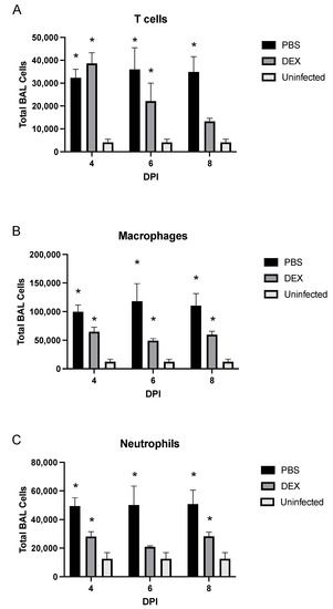 BAL cell phenotypes during IBV infection. BAL cell phenotypes from mice treated with PBS (black bars) or 10 mg/kg DEX (gray bars) and uninfected, untreated mice (white bars) were stained for (A) CD3+ T cells, (B) CD3−/CD11b+/Ly6G− macrophages, and (C) CD3−/CD11b−/Ly6G+ neutrophils, as determined by flow cytometry. Bars represent the mean +/− SEM of total BAL leukocytes on days 4, 6, and 8 pi (DPI). * p < 0.05 by two-way analysis of variance (ANOVA) with Bonferroni’s correction compared with uninfected, untreated mice. (n = 3–5 mice/group/time point).