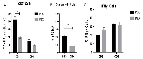 On day 8 pi, the CTL to Th ratio in the BAL was 2:1 (Figure 5A), a finding similar to that found in a recent study of IAV-infected mice [37], and there were significantly (p < 0.05) more CTLs in PBS-treated mice than in DEX-treated mice. To determine the BAL T cell functionality, BAL cells collected on day 8 pi were nonspecifically stimulated with PMA/ionomycin, and intracellular levels of granzyme B and IFNγ were determined. The BAL cells were analyzed by flow cytometry and lymphocyte-gated, i.e., SSCloFSClo/CD3+ and CD4+, CD8+, and ‘cytokine’hi. The results showed that 20% of PBS-treated and 10% of DEX-treated CTLs were positive for granzyme B (Figure 5B), while 20% of PBS-treated and 25% of DEX-treated CD8+ cells expressed IFNγ and 30% of CD4+ T cells produced IFNγ, regardless of treatment (Figure 5C). The appreciably fewer granzyme-B-expressing CTLs in the DEX-treated compared with PBS-treated mice was not unexpected, as DEX treatment has been shown to modify the immune response by preventing granzyme B transcription [38,39]. Interestingly, another paper describing DEX in the RSV mouse model showed IFN-independent downregulation of mucosal responses, suggesting that DEX, in this model, downregulated granzyme B and not IFNγ [40]. Taken together, these data suggest that IBV infection induces a robust BAL cell response in which DEX treatment reduces the CTL response.