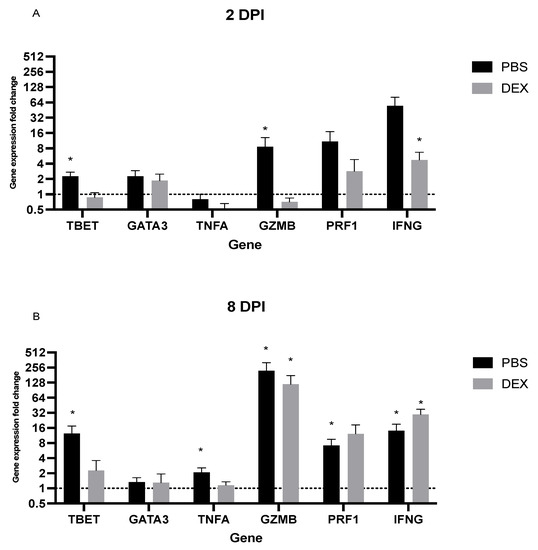 Understanding host gene expression specific to IBV infection can aid the understanding of immunity and disease pathogenesis. Specific gene expression patterns (or signatures) reflect the biological state and can serve as biomarkers. The expression of lung mRNA transcripts was determined by PCR from B6-infected mice early (day 2 pi) or later (day 8 pi) after infection to determine the relative gene expression changes using primer pairs noted in Table 1 [26]. Early gene expression (day 2 pi) in PBS-treated mice showed upregulated Th1-type (TBET and IFNG) genes, while DEX-treated mice expressed upregulated IFN (Figure 6A). TBET is a T-box gene encoding transcription factors involved in the regulation of developmental processes and is the human ortholog of the mouse Tbx21/Tbet gene [41]. Studies in mice showed that TBET is a Th1 cell-specific transcription factor that controls the expression of the hallmark Th1 cytokine, IFNγ [42]. By contrast, PBS-treated mice displayed upregulated granzyme B (GZMB) and perforin (PRF1) transcripts, which are CTL-associated responses that induce apoptosis of virally-infected cells [43]. On day 8 pi, PBS-treated B6 mice had a 12-fold increase in TBET and IFNG transcript expression, while DEX-treated mice had reduced (2–4-fold) expression of TBET but a 32-fold increase of IFNγ (IFNG) (Figure 6B). This large increase is consistent with a previous report showing that dexamethasone reduced inflammation without altering IFN responses during RSV infection in mice [40]. Lungs from PBS-treated mice had increases in GZMB and PRF1 transcript expression, which is consistent with the CTL functional findings reported here. DEX-treated mice had similar increases. There was a 250-fold increase in GZMB and a 16-fold increase in PRF1 transcript expression in the PBS-treated mice, as well as a 125-fold and a 32-fold increase in GZMB and PRF1 transcript expression in the DEX-treated group, respectively. Interestingly, TNFA (TNFα), a canonical pro-inflammatory cytokine, was not substantially upregulated on day 2 pi regardless of treatment as previously observed [44], and DEX treatment downregulated TNFA transcript expression. By contrast, on day 8 pi, there was considerable upregulation of TNFA in the PBS-treated group. Taken together, the transcript expression analysis suggests that CTL- and Th1-like genes are substantially upregulated on day 8 pi.