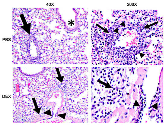 H&E staining of lungs: 40× (left) and 200× (right) magnification photomicrograph of a lung of a mouse that was treated with PBS (top) or DEX (bottom) and infected with IBV on day 8 pi. Bronchiolitis (asterisks), perivascular inflammation (arrows), vasculitis, (arrowheads).